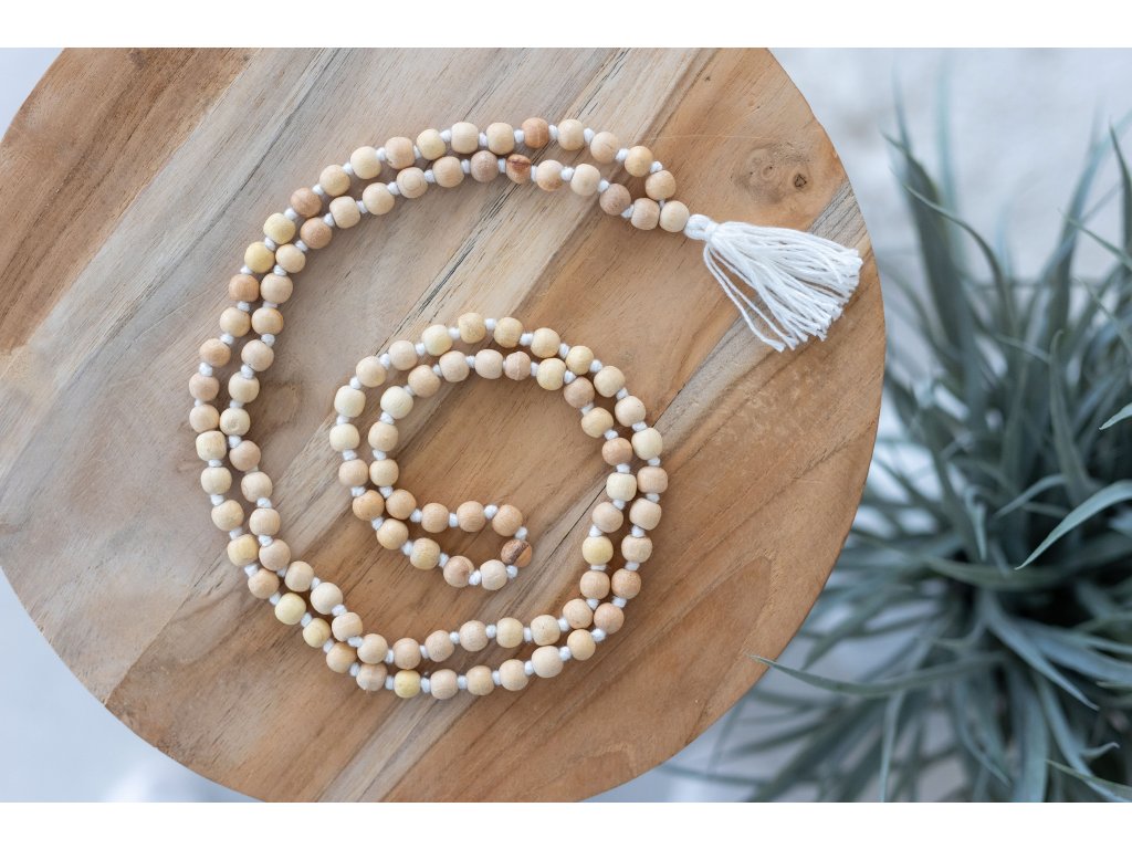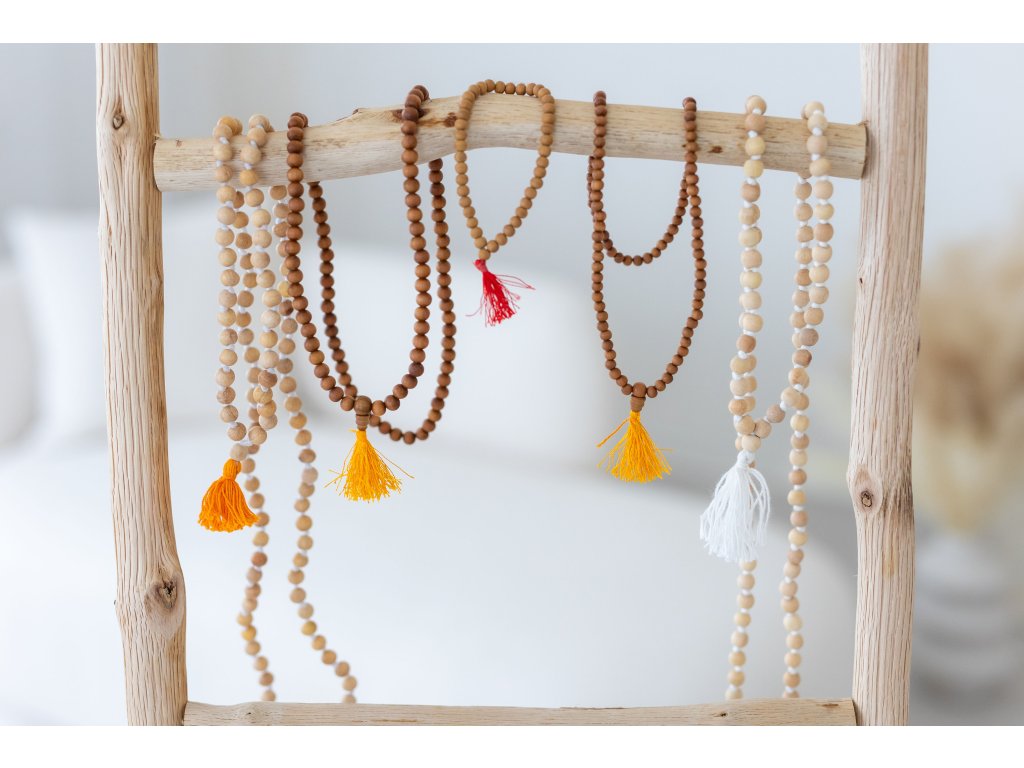 Indický „růženec“ z přibližně 108 korálků ze dřeva léčivého stromu neem (nimba). Celková délka asi 117 cm, korálky mají průměr 8 až 9 mm. Mezi každým korálkem je malý uzlík a na konci bílý střapec. V naší nabídce najdete i pytlíček na malu zde.